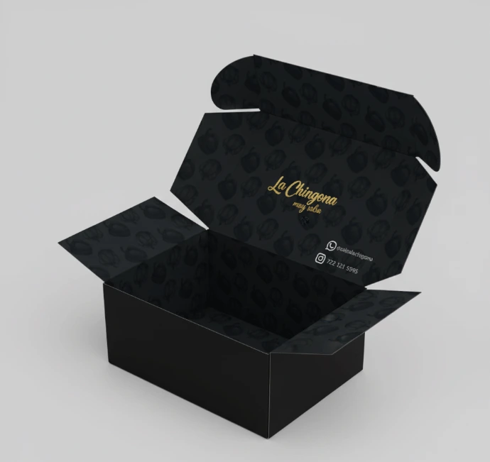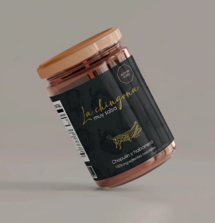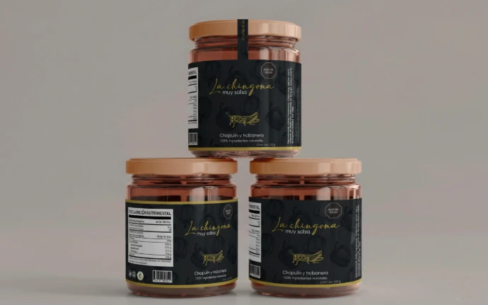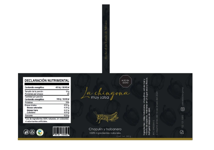 Diseño de etiqueta y empaque para la salsa artesanal La Chingona. Se creó una etiqueta y una caja con estética unificada, combinando ilustraciones, tipografía elegante y una paleta oscura con detalles dorados para destacar su carácter gourmet.